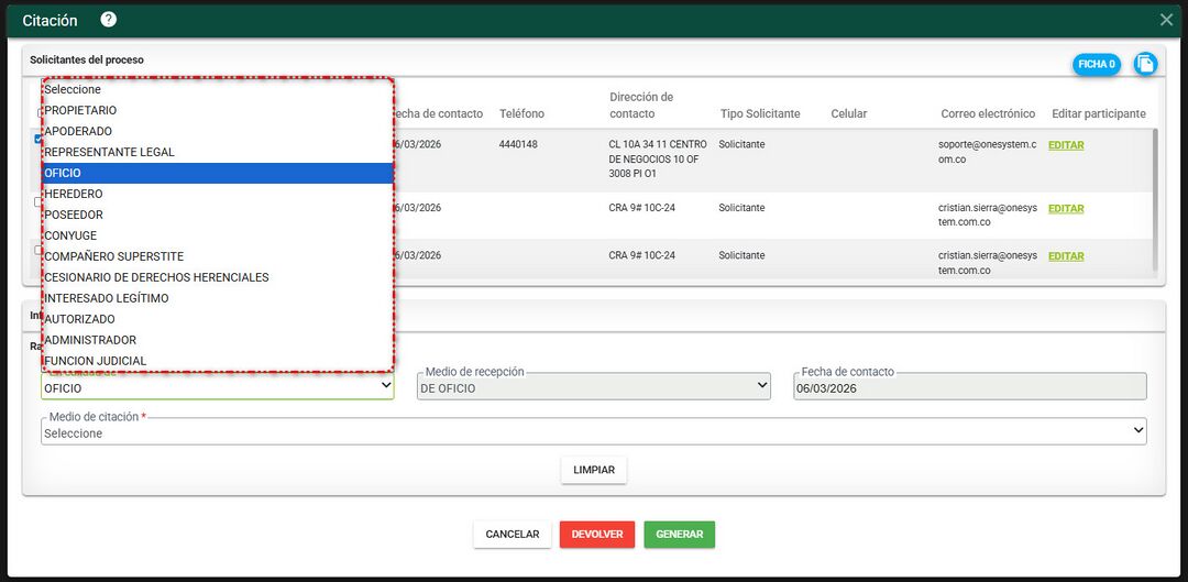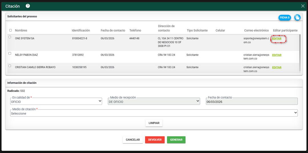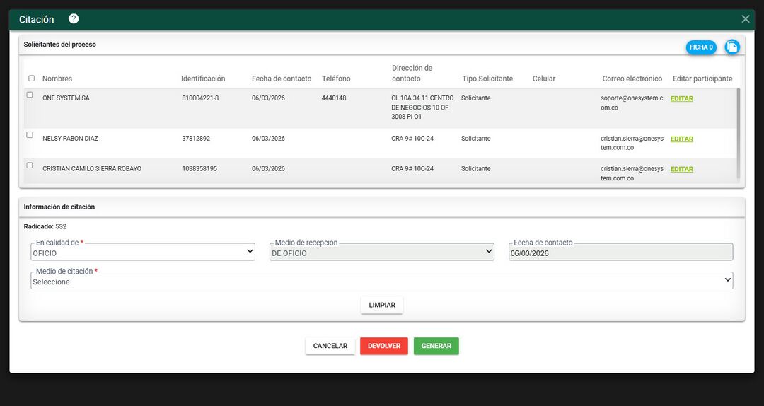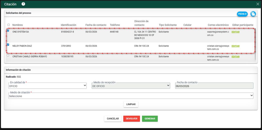 El sistema filtra el o los solicitantes que fueron registrados al momento de la radicación y los terceros afectados si estos fueron registrados, que son las mismas personas que están pendientes por realizarle la citación.