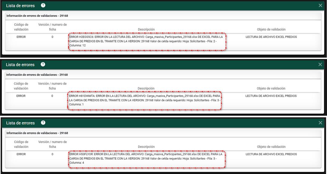 En el momento de realizar la carga masiva de participantes/solicitantes, se pueden presentar varios errores por el mal diligenciamiento del archivo.
