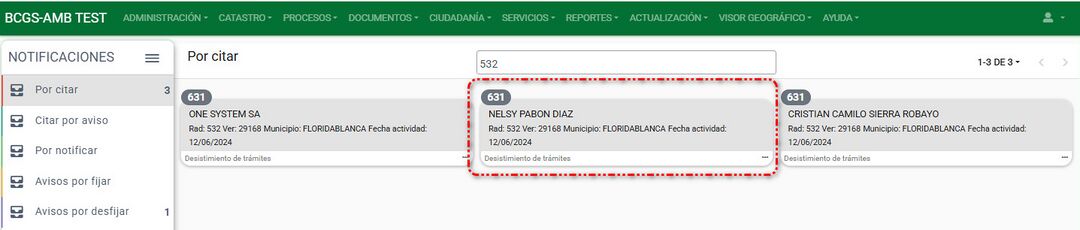Al tener una citación el sistema muestra la persona en el panel "Por notificar".