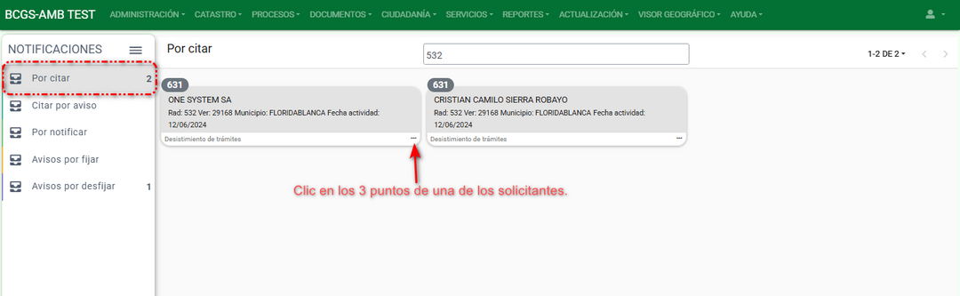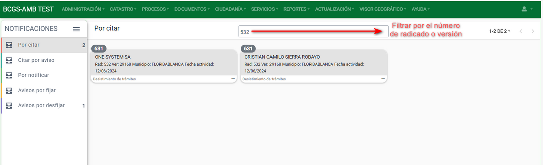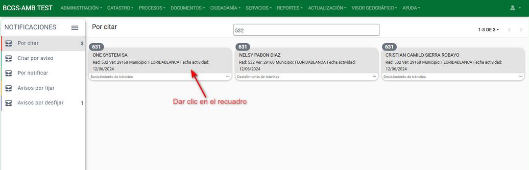 Confirmar la generación del documento de citación por aviso y a continuación el sistema ubica el solicitante en el grupo de Citar por aviso