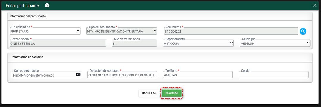 Se abre el formulario de editar participante, se actualizan los datos necesarios y luego damos clic en el botón GUARDAR para almacenar la información.