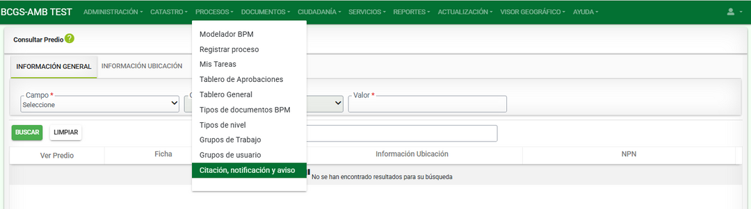 Para iniciar el proceso de notificación, debe ingresar a la pestaña Procesos y luego Citación, Notificación y aviso