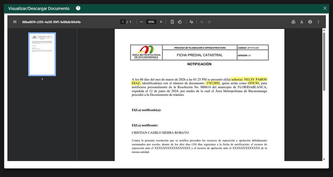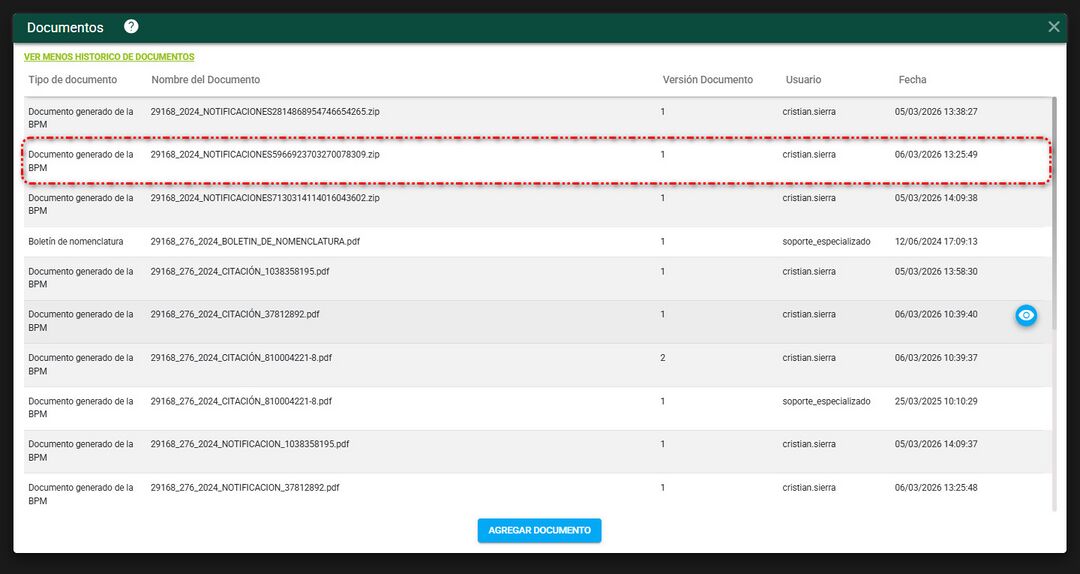 Aquí se visualizan todos los documentos asociados al trámite, en este caso ubicamos el documento de citación generado.