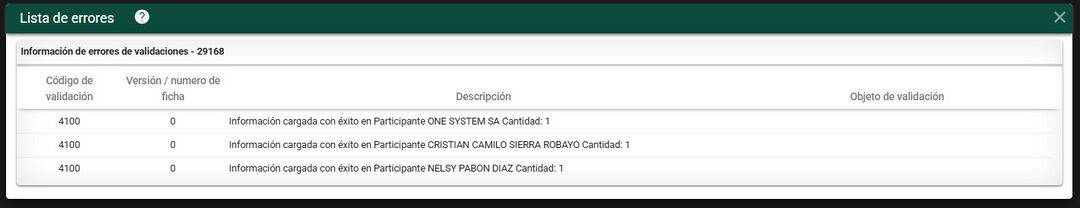 Al finalizar la carga de los participantes se visualiza el mensaje de carga exitosa,