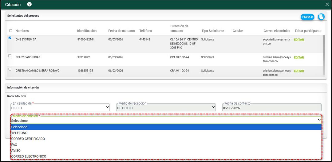 Luego diríjase al campo Medio de citación y escoja el que usted requiera. Tenga en cuenta que la citación se puede realizar por: